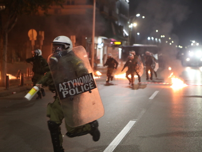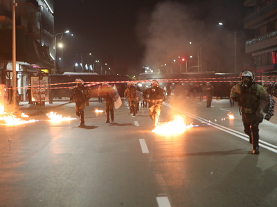 Οι κουκουλοφόροι πέταξαν δεκάδες μολότοφ στα ΜΑΤ που βρίσκονταν στην Καμάρα.