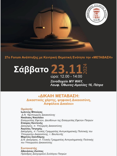 Το Σάββατο 23 Νοεμβρίου και ώρα 1 μμ, ο Αχαιός εγκληματολόγος (πρώην Γενικός Γραμματέας του Υπουργείου Δικαιοσύνης) Άγγελος Τσιγκρής, θα μιλήσει σε εκδήλωση του Δικηγορικού Συλλόγου της Πάτρας, στο πλαίσιο του 27ου Forum Ανάπτυξης, με θέμα: “Ψηφιακός μετασχηματισμός και επιτάχυνση στην απονομή δικαιοσύνης”.