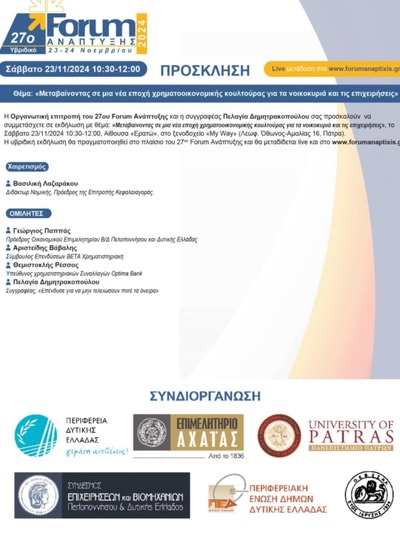Στα πλαίσια του 27ου Forum Ανάπτυξης το Σάββατο 23 Νοεμβρίου θα πραγματοποιηθεί συζήτηση με θέμα "Μεταβαίνοντας σε μια νέα εποχή χρηματοοικονομικής κουλτούρας για τα νοικοκυριά και τις επιχειρήσεις" στο ξενοδοχείο My Way.