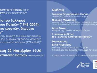 Επίσης ,το Γαλλικό Ινστιτούτο Ελλάδος στην Πάτρα την Παρασκευή 22 Νοεμβρίου 2024, και ώρα 19:30, πραγματοποιεί μια ξεχωριστή εκδήλωση, με κεντρικό ομιλητή τον διακεκριμένο καθηγητή και συγγραφέα κ. Νικόλα Μανιτάκη, με θέμα: «Η ιστορία του Γαλλικού Ινστιτούτου Πατρών (1945-2024): πορίσματα ερευνών, βιώματα μαθητών».