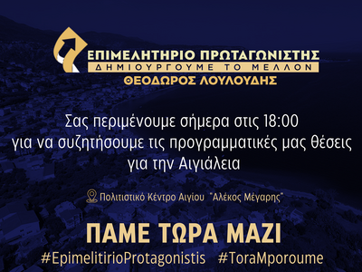 Σήμερα Δευτέρα, 25 Νοεμβρίου 2024, στις 6 μ.μ., στο Πολιτιστικό Κέντρο Αιγίου "Αλέκος Μέγαρης", ο Συνδυασμός "Επιμελητήριο Πρωταγωνιστής" παρουσιάζει τις προγραμματικές του θέσεις για την ανάπτυξη και την προοπτική της Αιγιάλειας.