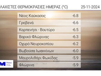 Αρκετά χαμηλές ελάχιστες θερμοκρασίες σημειώθηκαν τις πρωινές ώρες της Δευτέρας 25/11 στα βόρεια και κεντρικά ηπειρωτικά τμήματα, με τη χαμηλότερη ελάχιστη θερμοκρασία να καταγράφεται στον Νέο Καύκασο Φλώρινας με -6,8 °C.