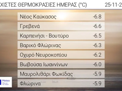 Αρκετά χαμηλές ελάχιστες θερμοκρασίες σημειώθηκαν τις πρωινές ώρες της Δευτέρας 25/11 στα βόρεια και κεντρικά ηπειρωτικά τμήματα, με τη χαμηλότερη ελάχιστη θερμοκρασία να καταγράφεται στον Νέο Καύκασο Φλώρινας με -6,8 °C. Σύμφωνα με το δίκτυο αυτόματων μετεωρολογικών σταθμών του Εθνικού Αστεροσκοπείου Αθηνών / meteo.gr οι οκτώ χαμηλότερες ελάχιστες θερμοκρασίες τις πρωινές ώρες της Δευτέρας 25/11, παρουσιάζονται στον παρακάτω πίνακα.