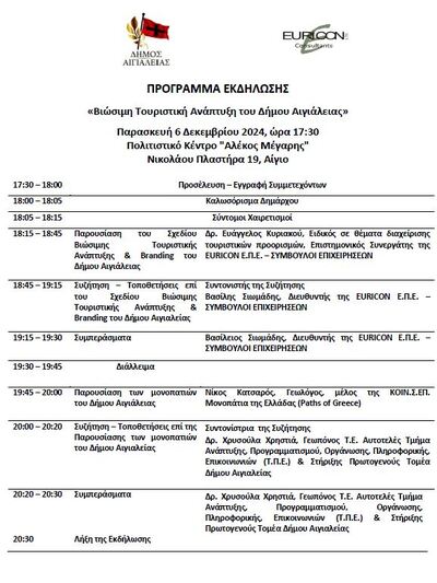 Την Παρασκευή 6 Δεκεμβρίου 2024 στο Πολιτιστικό Κέντρο «Αλέκος Μέγαρης», Νικολάου Πλαστήρα 19, στο Αίγιο, στις 17:30 διοργανώνεται ανοιχτή εκδήλωση. Στο πρώτο μέρος της εκδήλωσης θα γίνει η παρουσίαση του Σχεδίου Βιώσιμης Τουριστικής Ανάπτυξης & Branding του Δήμου Αιγιάλειας» από την EURICON ΕΠΕ, Σύμβουλος Διαχείρισης και Ανάπτυξης Προορισμού. Στο δεύτερο μέρος θα γίνει η παρουσίαση των μονοπατιών του Δήμου Αιγιάλειας από την εταιρεία “Μονοπάτια της Ελλάδας ή Paths of Greece”. Κάθε μέρος της εκδήλωσης συνοδεύεται από συζήτηση και τοποθετήσεις των συμμετεχόντων. H εκδήλωση είναι ανοιχτή σε τοπικούς φορείς αλλά και σε κάθε ενδιαφερόμενο.