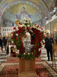 Τήν Παραμονή τῆς ἑορτῆς, ἐτελέσθη ὁ μέγας Πανηγυρικός Ἑσπερινός, ἐνῶ πλῆθος προσκυνητῶν κατέκλυσε τόν Ἱερό Ναό, μέ ἓνα προσκύνημα νά συνεχίζεται μέ ἀκατάπαυστη ροή.