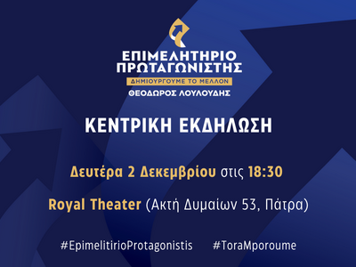 "Ο επικεφαλής του συνδυασμού "Επιμελητήριο Πρωταγωνιστής", Θεόδωρος Λουλούδης και οι υποψήφιοι σας προσκαλούν στην κεντρική εκδήλωση της προεκλογικής εκστρατείας, η οποία θα πραγματοποιηθεί αύριο, Δευτέρα, 2 Δεκεμβρίου 2024, στις 18:30, στο Royal Theater, στην Πάτρα.