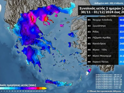Στον χάρτη αποτυπώνονται τα αθροιστικά ύψη βροχόπτωσης του διημέρου έως τις 20:00 το βράδυ της Κυριακής 01/12 (συνολική διάρκεια 44 ώρες) όπως αυτά καταγράφηκαν από 486 μετεωρολογικούς σταθμούς του δικτύου αυτόματων μετεωρολογικών σταθμών του meteo.gr/Εθνικού Αστεροσκοπείου Αθηνών και επισημαίνονται τα 10 μεγαλύτερα.