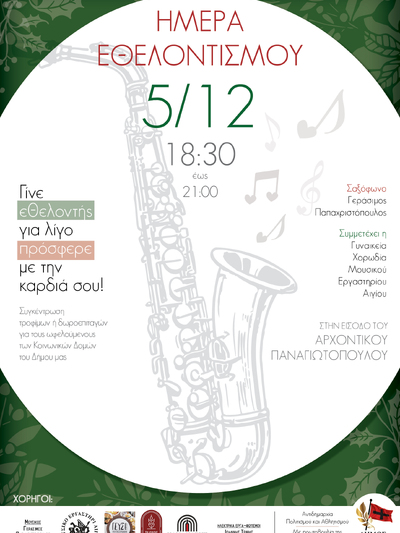 Ο Γεράσιμος Παπαχριστόπουλος θα «ντύσει» το απόγευμα με τις νότες του σαξοφώνου του, ενώ θα συμμετέχει και η Γυναικεία Χορωδία του Μουσικού Εργαστηρίου Αιγίου! Η συμμετοχή όλων θα συνοδευτεί από μια ζεστή φιλοξενία με κρασί και παραδοσιακά κεράσματα!