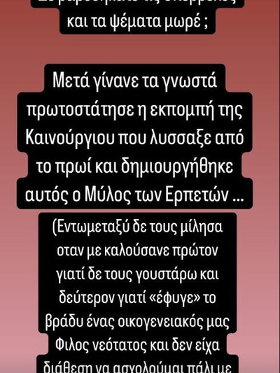 «Μετά γίνανε τα γνωστά, πρωτοστάτησε η εκπομπή της Καινούργιου που λύσσαξε από το πρωί και δημιουργήθηκε ο Μύλος των Ερπετών. Εν τω μεταξύ δεν τους μίλησα όταν με καλούσαν, πρώτον γιατί δεν τους γουστάρω και δεύτερον γιατί «έφυγε» το βράδυ ένας οικογενειακός φίλος νεότατος και δεν είχα διάθεση να ασχολούμαι πάλι με ανυπόστατες φθήνιες», συμπλήρωσε ο τραγουδιστής.