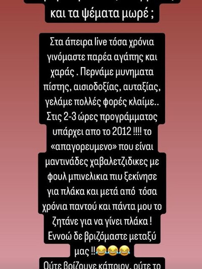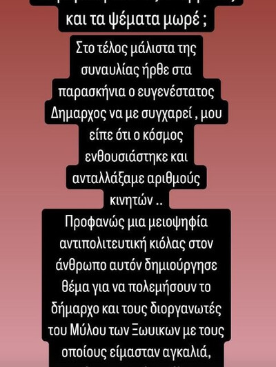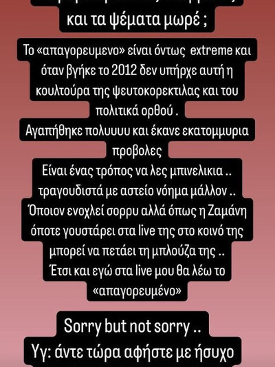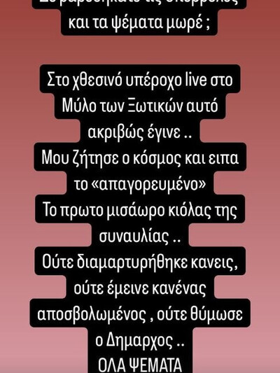 Μέσα από τα social media του, ο τραγουδιστής τόνισε: «Δεν βαρεθήκατε τις υπερβολές και τα ψέματα μωρέ; Στο χθεσινό υπέροχο live στον Μύλο Των Ξωτικών αυτό ακριβώς έγινε. Μου ζήτησε ο κόσμος και είπα το «απαγορευμένο». Το πρώτο μισάωρο κιόλας της συναυλίας. Ούτε διαμαρτυρήθηκε κανείς, ούτε έμεινε κανένας αποσβολωμένος, ούτε θύμωσε ο Δήμαρχος. Όλα ψέματα».