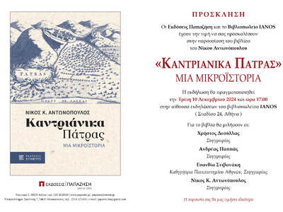 Την ερχόμενη Τρίτη 10 Δεκεμβρίου 2024, στις 17.00 η Αλυσίδα Πολιτισμού IANOS και οι Εκδόσεις Επίμετρο, διοργανώνουν εκδήλωση παρουσίασης του βιβλίου του Νίκου Αντωνόπουλου, πρώην αντιδημάρχου της Πάτρας, με τίτλο «Καντριάνικα Πάτρας – Μια μικροϊστορία».