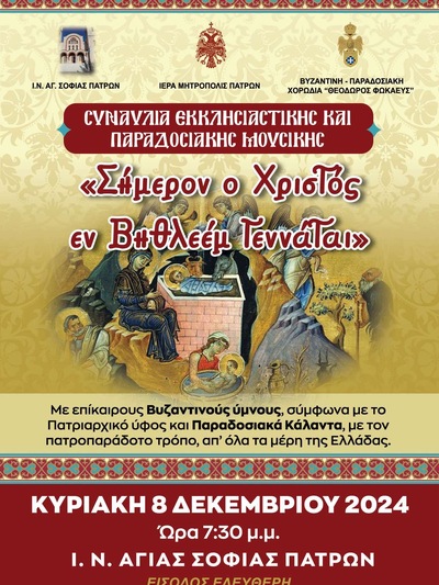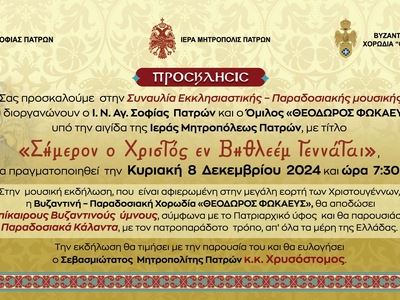 Αυτή την Κυριακή 8 Δεκεμβρίου 2024 και ώρα 7.30 μ.μ., στον Ιερό Ναό Αγίας Σοφίας Πατρών, η εκλεκτή χορωδία «Θεόδωρος Φωκαεύς» με υπεύθυνο τον συμπολίτη ιατρό Γιώργο Βέργο, θα παρουσιάσει επίκαιρη, γιορτινή εκδήλωση με τίτλο «Σήμερον ο Χριστός εν Βηθλεέμ γεννάται».