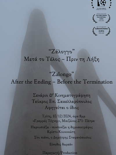 Ο Πολυχώρος Πολιτισμού Γραμμές Τέχνης στην οδό Μαιζώνος 271, έναντι σταθμού τρένου, στην Πάτρα, εγκαινιάζει τις κινηματογραφικές βραδιές του με την προβολή της βραβευμένης ταινίας μεσαίου μήκους του Τεύκρου Σακελλαρόπουλου: «Ζάλογγο- Μετά το Τέλος- Πριν τη Λήξη», της Cdriva ProdActions. Η προβολή θα γίνει την Τρίτη 10 Δεκεμβρίου 2024 στις 8 μμ.