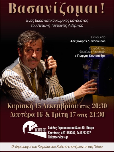 Μετά τον «Κοιμώμενο Χαλεπά», ο Αλέξανδρος Λιακόπουλος και ο Γιώργης Κοντοπόδης, έρχονται στην Πάτρα, στο θέατρο Act, στις σκάλες Γεροκωστοπούλου, με τον νέο μονόλογο του Αντώνη Τσιπιανίτη Αθερινού, με τίτλο «Βασανίζομαι!» για 3 παραστάσεις στις 15, 16 και 17-12.