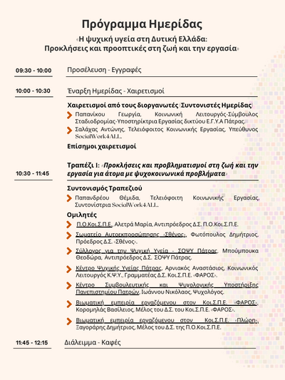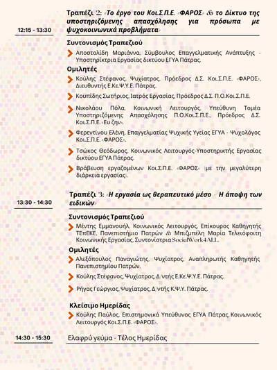 - Τραπέζι 2 με θέμα : «Το έργο του Κοι.Σ.Π.Ε. «ΦΑΡΟΣ» Κοι.Σ.Π.Ε. & το Δίκτυο της υποστηριζόμενης απασχόλησης για πρόσωπα με ψυχοκοινωνικά προβλήματα» 12:15 μ.μ. -13:30 μ.μ