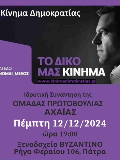 Ομάδα Πρωτοβουλίας για το νεοσυσταθέν Κίνημα Δημοκρατίας του Στέφανου Κασσελάκη ιδρύεται και στην Αχαΐα με πρωτοβουλία πολιτικών στελεχών που τον στηρίζουν.