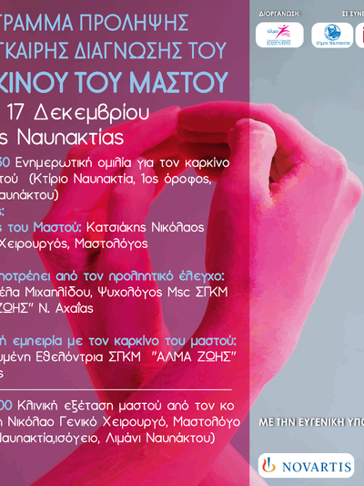 12:30-13:30 Ενημερωτική ομιλία για τον καρκίνο του μαστού στο κτίριο Ναυπακτία, Λιμάνι Ναυπάκτου