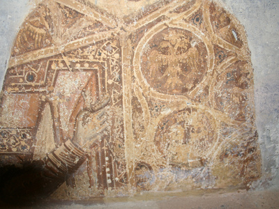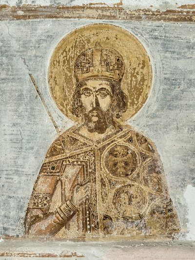 Στην τοιχογραφία απεικονίζεται η μορφή ενός ώριμου άνδρα που φέρει αυτοκρατορικά «διάσημα» (πολυτελή λώρο πάνω από τον ανοιχτόχρωμο σάκκο, διάλιθο στέμμα) και κρατά σταυροφόρο σκήπτρο. Ο χρυσοκέντητος πορφυρός του μανδύας διακοσμείται με μετάλλια, στα οποία εγγράφονται δικέφαλοι αετοί με στέμμα ανάμεσα στις κεφαλές τους, διακριτικό των μελών της οικογένειας των Παλαιολόγων. Η παρουσία των δικέφαλων αετών στo ένδυμα της μορφής, σε συνδυασμό με τα υπόλοιπα insignia, αποτελούσαν ένα εικονογραφημένο μήνυμα που επέτρεπε στον θεατή να ταυτοποιήσει τον άντρα με αυτοκράτορα.