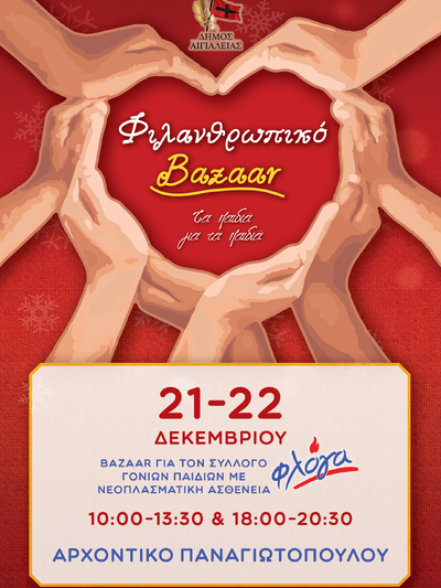 Ο Σύλλογος Γονιών Παιδιών με Νεοπλασματική Ασθένεια « Φλόγα», Παράρτημα Πάτρας, θα πραγματοποιήσει χριστουγεννιάτικο φιλανθρωπικό bazaar με τίτλο «Τα παιδιά για τα παιδιά», στο Αρχοντικό Παναγιωτόπουλου στο Αίγιο.