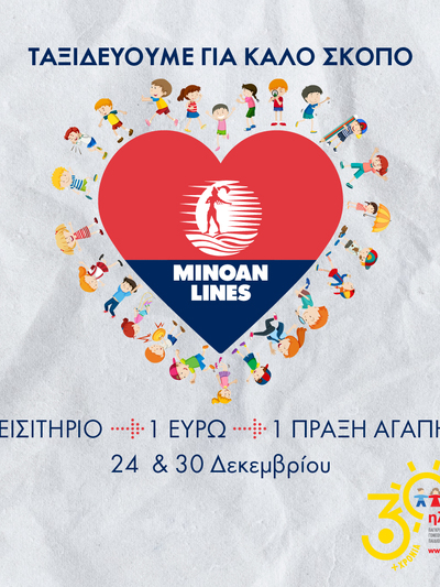 Αυτές τις γιορτές, εσείς επιλέγετε τη MINOAN LINES και η εμβληματική ελληνική εταιρία ενισχύει τη δράση του Παγκρήτιου Συλλόγου Γονέων και Φίλων Παιδιών με Νεοπλασία «Η Ηλιαχτίδα». Με κεντρικό άξονα της δράσης «1 εισιτήριο à 1 ευρώ à 1 πράξη αγάπης», η MINOAN LINES προσφέρει €1 από κάθε εισιτήριο σε όλα τα δρομολόγια που θα πραγματοποιηθούν στις 24 και 30 Δεκεμβρίου, στη γραμμή ΠΕΙΡΑΙΑΣ – ΜΗΛΟΣ – ΗΡΑΚΛΕΙΟ και αντίστροφα.