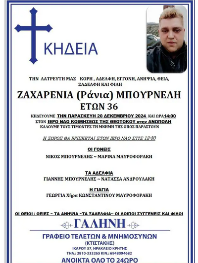 Η κηδεία της θα γίνει στον Ιερό Ναό Κοιμήσεως της Θεοτόκου στην Ανώπολη στις 2 το μεσημέρι. Η σορός της 36χρονης Ράνιας θα βρίσκεται στην εκκλησία από τις 12.30 το μεσημέρι.