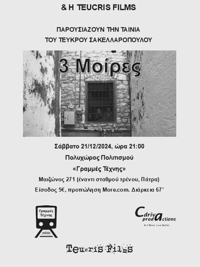 Η Cdriva ProdActions και η Teucris Films, παρουσιάζουν την ταινία του Τεύκρου Σακελλαρόπουλου «3 Μοίρες» (remastered) αυτό το Σάββατο 21 Δεκεμβρίου 2024 στις 9 μμ, στον Πολυχώρο Πολιτισμού Γραμμές Τέχνης (οδός Μαιζώνος 271, έναντι σταθμού τρένου), στην Πάτρα.