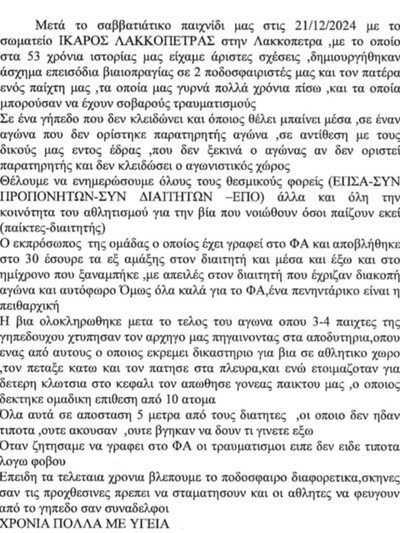 Καταγγελίες του Πείρου Ισώματος σε βάρος του Ίκαρου Λακκόπετρας για τα όσα εξελίχθηκαν μετά το τέλος του μεταξύ τους αγώνα