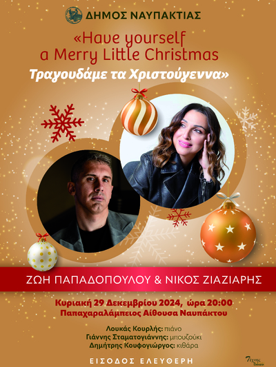 Την γιορτινή Κυριακή 29 Δεκεμβρίου 2024 & ώρα 20:00 στην Παπαχαραλάμπειο Αίθουσα Ναυπάκτου – Τίτλος τηςσυναυλίας, «Have yourself a Merry Little Christmas Τραγουδάμε τα Χριστούγεννα»