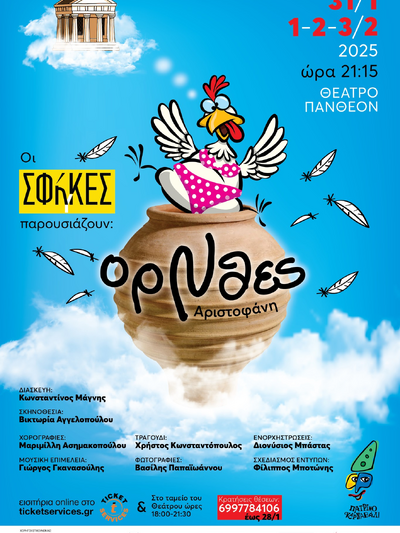 Με αναφορά στο έργο του Αριστοφάνη ΟΡΝΙΘΕΣ, η απόδοση από την θεατρική ομάδα των Σφηγκών έρχεται να σατιρίσει, να καυτηριάσει τα ευτράπελα του σήμερα, προσφέροντας το γέλιο αλλά δημιουργώντας και προβληματισμούς.