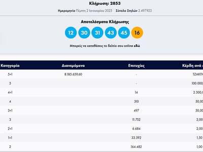 Οι αριθμοί που κληρώθηκαν είναι οι: 12, 30, 31, 43, 45 και τζόκερ το 16.