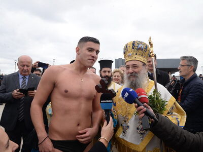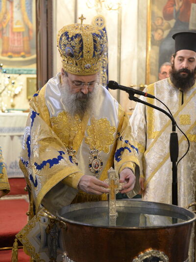 Ο αγιασμός των υδάτων έγινε από τον Μητροπολίτη Πατρών Χρυσόστομο στο Μόλο της Αγίου Νικολάου, όπου αρκετοί τολμηροί Πατρινοί βούτηξαν στα κρύα νερά για τον Σταυρό που τον έπιασε ο μαθητής της τρίτης λυκείου Χρήστος Βουκελάτος, ο οποίος τα καταφέρνει για δεύτερη φορά.