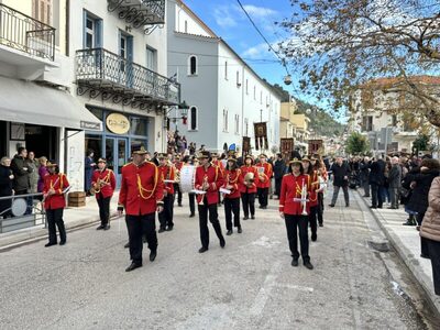 Ακολούθησε η λιτάνευση της εικόνας των Θεοφανείων,ενώ με πομπή που προεξήρχε η Παπαχαραλάμπειος δημοτική φιλαρμονική,κλήρος και λαός μετέβησαν στο λιμάνι της πόλης για τον καθαγιασμό των υδάτων.