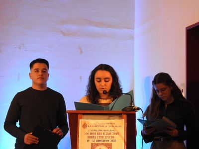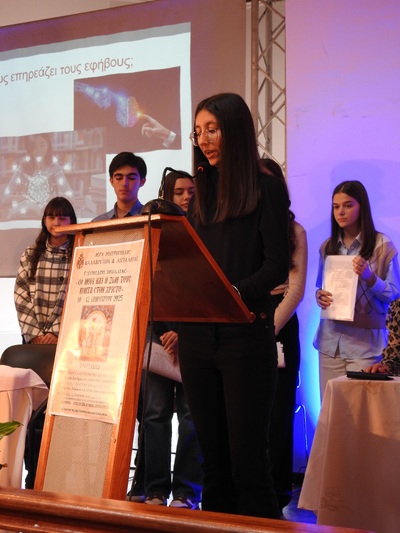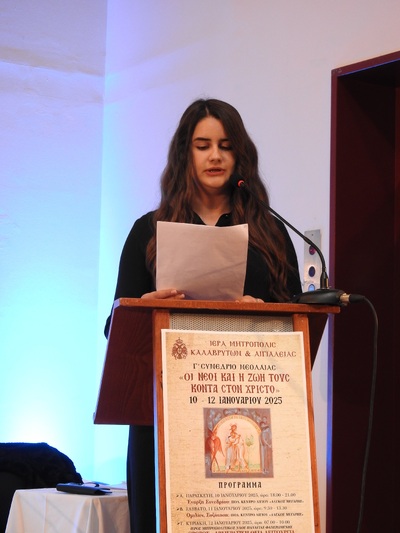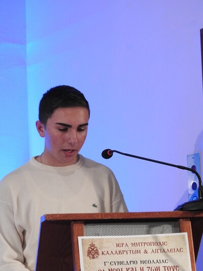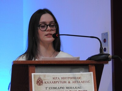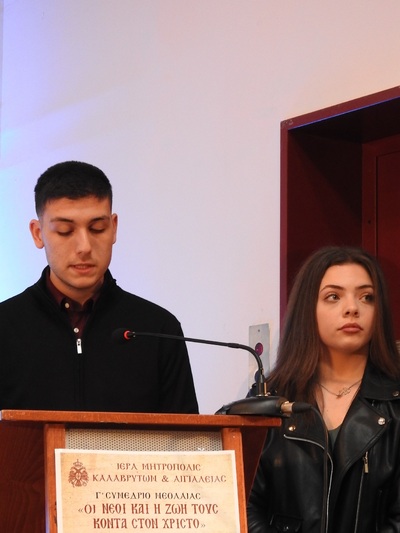 Τέλος, το θέμα της σχέσεως των νέων με την Εκκλησία ανέπτυξαν η μαθήτρια του ΓΕΛ Κλειτορίας Αικατερίνη Καραχάλιου και η μαθήτρια του ΓΕΛ Καλαβρύτων Δέσποινα Μιχαλοπούλου.