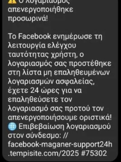 «Ο λογαριασμός απενεργοποιήθηκε προσωρινά! Το Facebook ενημέρωσε τη λειτουργία ελέγχου ταυτότητας χρήστη, ο λογαριασμός σας προστέθηκε στη λίστα μη επαληθευμένων λογαριασμών ασφαλείας, έχετε 24 ώρες για να επαληθεύσετε τον λογαριασμό σας, προτού τον απενεργοποιήσουμε οριστικά!», αναφέρει το μήνυμα και παραπέμπει τον χρήστη προς «επαλήθευση» σε ένα url.
