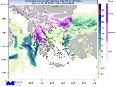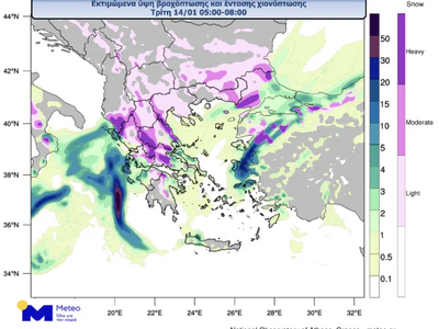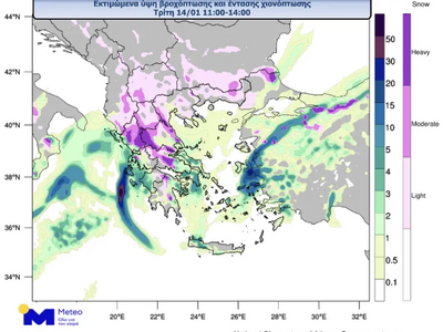 Στους παρακάτω προγνωστικούς χάρτες αποτυπώνεται ο αθροιστικός υετός 3ώρου με πράσινες και μπλε αποχρώσεις καθώς και η εκτιμώμενη ένταση ένταση των χιονοπτώσεων με ροζ και μωβ αποχρώσεις. Οι χάρτες αναφέρονται στα διαστήματα Δευτέρα (13/01) 23:00-Τρίτη (14/01) 02:00, Τρίτη (14/01) 05:00-08:00 και Τρίτη (14/01) 11:00-14:00.