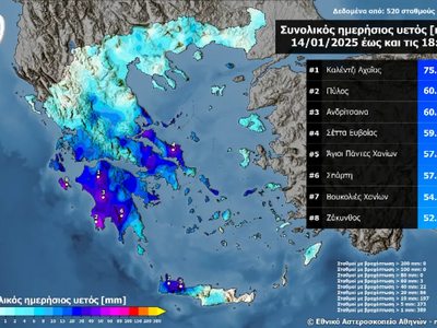 Στον παρακάτω χάρτη αποτυπώνονται τα συνολικά ύψη βροχόπτωσης έως τις 18:20 της Τρίτης 14/01 όπως αυτά καταγράφηκαν από 520 μετεωρολογικούς σταθμούς του δικτύου αυτόματων μετεωρολογικών σταθμών του Εθνικού Αστεροσκοπείου Αθηνών / meteo.gr, ενώ επισημαίνονται τα 8 μεγαλύτερα.