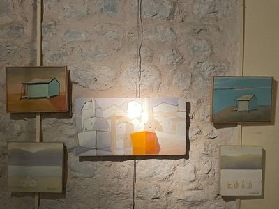Κεντρικός πίνακας της έκθεσης μια απεικόνιση του μέγαρου της Αλάμπρας στα Ψηλαλώνια σε τόνους γαλάζιου, βιολετί και πορτοκαλοκίτρινου που μας θύμισε το «Νέον» δια χειρός Τσαρούχη. Το στίγμα της εξέλιξής του βέβαια αποκαλύπτεται σε πιο αφαιρετικές συνθέσεις πάνω σε τελάρα διαφόρων σχημάτων. Επιμένει στα τοπία με στοιχεία ενατένισης και φαντασίωσης, τις σκηνές καθημερινότητας και τις νεκρές φύσεις αντικειμένων. Όλα μοιάζουν με σκηνικά που έχουν στηθεί να αγναντεύουν γαλήνια το χρόνο.