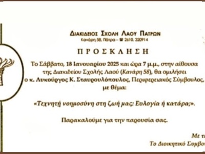 Μία ενδιαφέρουσα όπως αναμένεται, και επίκαιρη ομιλία έχει προγραμματιστεί να γίνει αυτό το Σάββατο 18 Ιανουαρίου 2025 στις 7 το απόγευμα στην αίθουσα της Διακιδείου Σχολής του Λαού στην οδό Κανάρη 58 μεταξύ της Κορίνθου και της Κανακάρη στην Πάτρα.