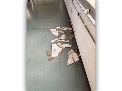 - Πτώσεις κομματιών της ψευδοροφής σε διάδρομο της Ακτινολογικής Κλινικής στον 2ο όροφο. Μια φοιτήτρια της Ιατρικής Σχολής του Πανεπιστημίου Πατρών που κάνει την πρακτική της στο νοσοκομείο, παρ’ ολίγο να τραυματιστεί, αφού τα κομμάτια από την οροφή έπεσαν δίπλα της, ενώ θα μπορούσε να τραυματιστεί οποιοσδήποτε άλλος βρισκόταν εκεί εκείνη την ώρα.