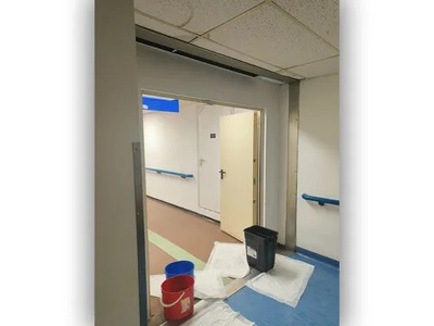 - Κουβάδες για να αντιμετωπιστεί το νερό που στάζει στη Β’ Παθολογική Κλινική στον 4ο όροφο, φαινόμενο που δεν είναι καινοφανές, αφού η ταράτσα στάζει εδώ και πολύ καιρό. Είχε μάλιστα σημειωθεί και η γνωστή πτώση ψευδοροφής.