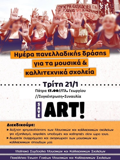 Εκδήλωση στην πλατεία Γεωργίου στην Πάτρα πραγματοποιεί στις 21 Ιανουαρίου ο Σύλλογος Γονέων και Κηδεμόνων του Μουσικού Σχολείου της Πάτρας, για την Πανελλήνια Ημέρα Δράσης για την Ενίσχυση των Μουσικών και Καλλιτεχνικών Σχολείων.