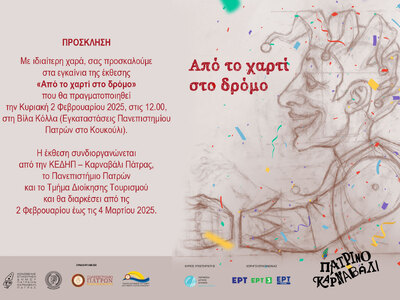 Έκθεση με τίτλο «Από το χαρτί στο δρόμο» διοργανώνεται από την ΚΕΔΗΠ-Καρναβάλι Πάτρας, το Πανεπιστήμιο Πατρών και το τμήμα Διοίκησης Τουρισμού του Πανεπιστημίου Πατρών. Η ανακοίνωση της KΕΔΗΠ αναφέρει: