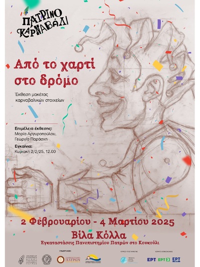 Η έκθεση με τίτλο «Από το χαρτί στο δρόμο» διοργανώνεται από την ΚΕΔΗΠ-Καρναβάλι Πάτρας, το Πανεπιστήμιο Πατρών και το τμήμα Διοίκησης Τουρισμού του Πανεπιστημίου Πατρών και θα εγκαινιαστεί την Κυριακή 2 Φεβρουαρίου 2025 και ώρα 12.00 στη Βίλα Κόλλα στις εγκαταστάσεις του Πανεπιστημίου Πατρών στο Κουκούλι, στο πλαίσιο της περιφερειακής Καρναβαλούπολης που θα πραγματοποιηθεί στον ίδιο χώρο από τις 11πμ έως τις 2μμ. Διάρκεια έκθεσης: 2/2/2025-4/3/2025, ώρες 16.00-20.00 καθημερινά συμπεριλαμβανομένων των Σαββατοκύριακων. Για πρωινές ώρες θα πραγματοποιούνται οργανωμένες επισκέψεις κατόπιν συνεννόησης στα τηλέφωνα: 2610-361754 και 2610-361755 (καθημερινά τις ώρες 10.00-14.00 εκτός Σαββατοκύριακου).
