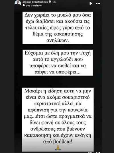 Ο Κωνσταντίνος Αργυρός ανέφερε: «Δεν χωράει το μυαλό μου όσα έχω διαβάσει και ακούσει τις τελευταίες ώρες γύρω από το θέμα της κακοποίησης ανηλίκων. Εύχομαι με όλη μου τη ψυχή αυτό το αγγελούδι που υποφέρει να σωθεί και να πάψει να υποφέρει».