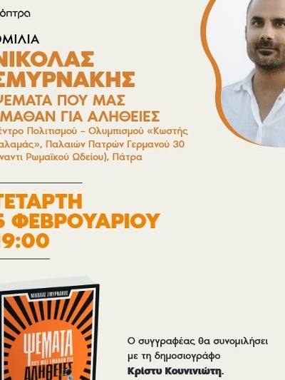 Ομιλία - Παρουσίαση του βιβλίου του Νικόλα Σμυρνάκη με τίτλο «Ψέματα που μας έμαθαν για αλήθειες» που κυκλοφορεί από τις εκδόσεις Διόπτρα, διοργανώνει το βιβλιοπωλείο Γωνιά του Βιβλίου της οικογένειας Παπαχρίστου. Η εκδήλωση θα γίνει στην Πάτρα την ερχόμενη Τετάρτη 5 Φεβρουαρίου 2025 & ώρα 19:00 στο Κέντρο Πολιτισμού – Ολυμπισμού «Κωστής Παλαμάς», στην οδό Γερμανού 30 (έναντι Ρωμαϊκού Ωδείου).