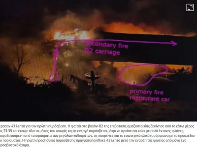Τα πρώτα δραματικά δευτερόλεπτα μετά τη σύγκρουση των αμαξοστοιχιών, όπου σημειώθηκαν δύο τεράστιες εκρήξεις και τα βαγόνια του Intercity 62 τυλίγονται στις φλόγες, περιγράφονται στο προσχέδιο του πορίσματος για τη διερεύνηση της τραγωδίας στα Τέμπη, που φέρνει στη δημοσιότητα σήμερα Τετάρτη η εφημερίδα «Καθημερινή».
