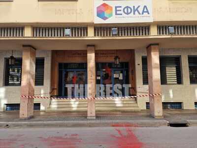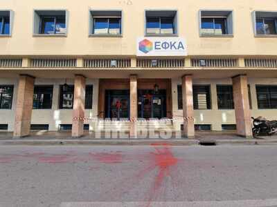 Σπασμένα τζάμια και κόκκινες μπογιές στο κτίριο του ΕΦΚΑ στο κέντρο της Πάτρας.
