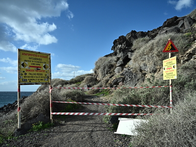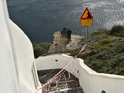 Ειδικά συνεργεία έχουν τοποθετήσει κορδέλες και σημάνσεις σε πολλά σημεία της Σαντορίνης, τόσο σε απόκρημνα όσο και σε σοκάκια της πόλης, προειδοποιώντας για τους κινδύνους.