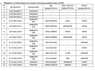 Τα διακριτικά των container και η σειρά με την οποία είναι αυτά σχηματισμένα συμπίπτουν τόσο στα 2 βίντεο που αναλύθηκαν παραπάνω, όσο και με αυτά του συρμού 63503 της εμπορικής αμαξοστοιχίας που διαπιστώθηκαν από την αστυνομία κατά το άνοιγμά τους στον εμπορικό σταθμό Θεσσαλονίκης.
