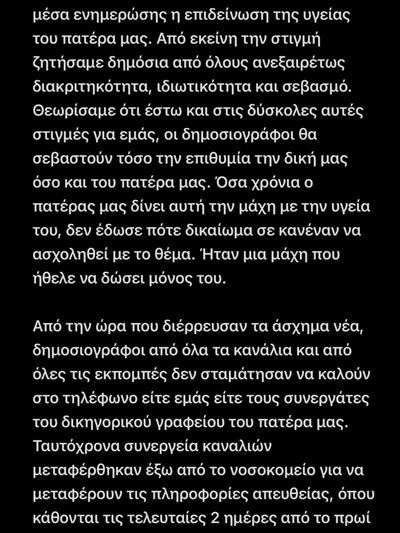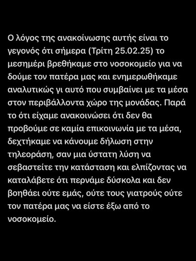 Ο λόγος της ανακοίνωσης αυτής είναι το γεγονός ότι σήμερα (Τρίτη 25.02.2025) το μεσημέρι βρεθήκαμε στο νοσοκομείο για να δούμε τον πατέρα μας και ενημερωθήκαμε αναλυτικώς για αυτό που συμβαίνει με τα μέσα στον περιβάλλοντα χώρο της μονάδας. Παρά το ότι είχαμε ανακοινώσει ότι δεν θα προβούμε σε καμία επικοινωνία με τα μέσα, δεχτήκαμε να κάνουμε δήλωση στην τηλεόραση, σαν μια ύστατη λύση να σεβαστείτε την κατάσταση και ελπίζοντας να καταλάβετε ότι περνάμε δύσκολα και δεν βοηθάει ούτε εμάς, ούτε τους γιατρούς, ούτε τον πατέρα μας να είστε έξω από το νοσοκομείο.